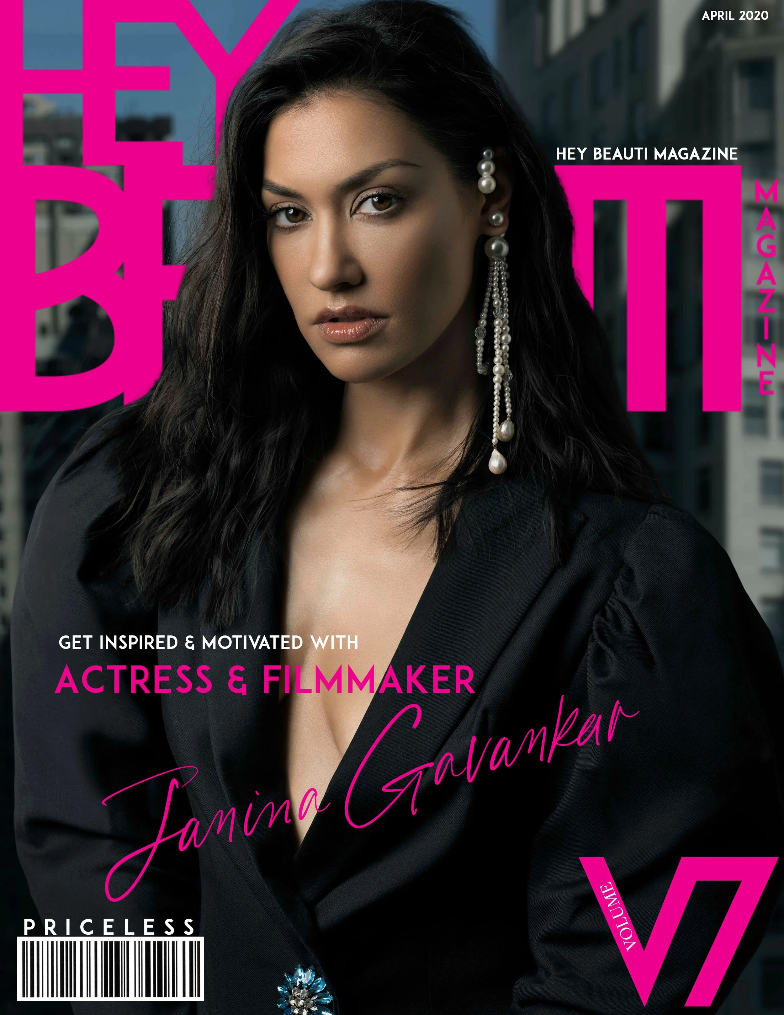 Cover of Hey Beauti Magazine featuring actress and filmmaker Janina Gavankar with dark hair, pearl earrings, wearing a black blazer, against a cityscape background, with magazine title in large pink letters and various headlines.